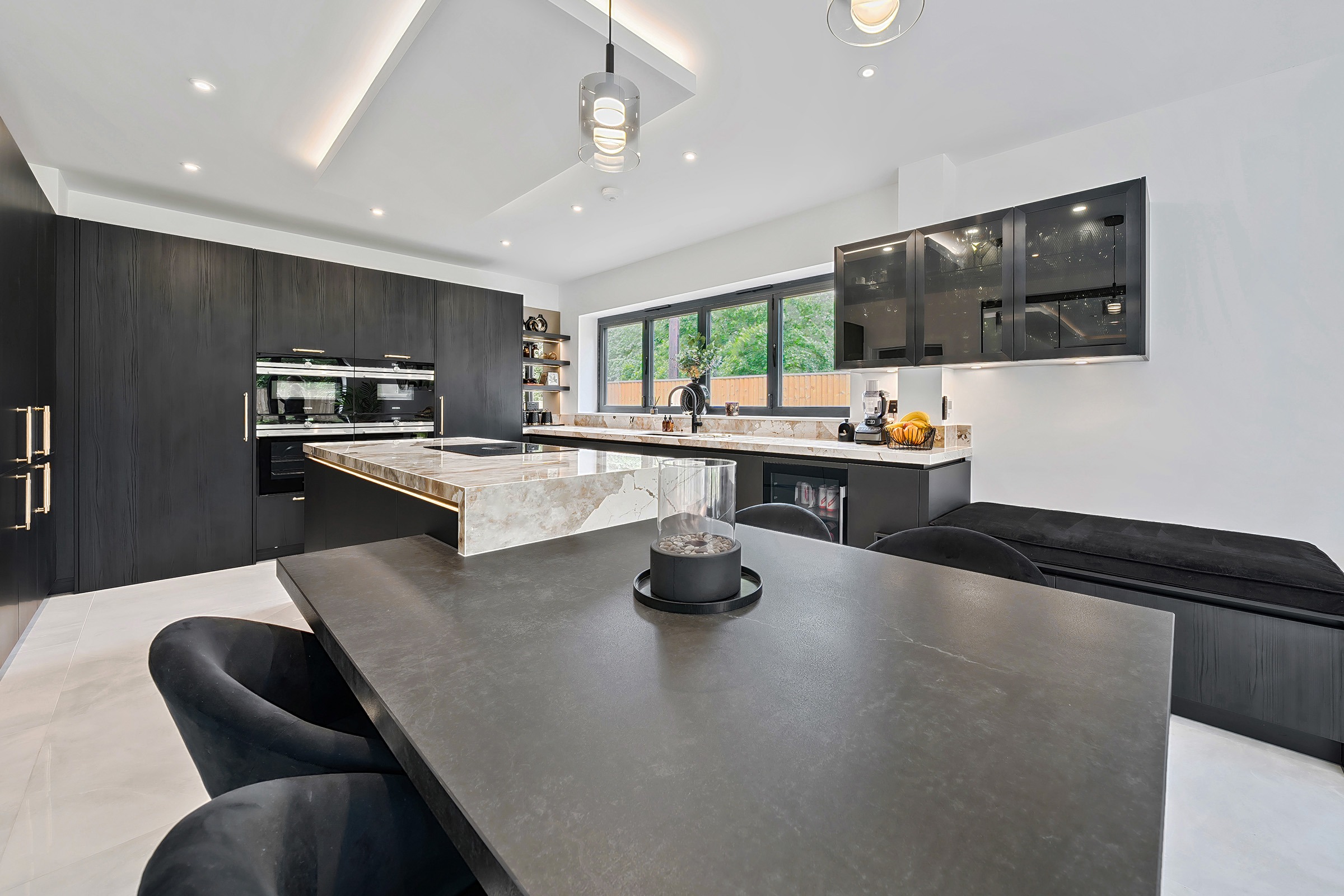 A dark kitchen has a design palette characterised by dark cabinetry, countertops, and sometimes appliances in rich, deep shades like black, deep blues, or dark greys. This design can feature solid colour blocks or incorporate dark textures such as dark wood like walnut, metal finishes, or dark stones, creating a sophisticated and contemporary aesthetic. The dark tones can add depth and drama to the space, making it feel cosy and luxurious. These kitchens exude elegance and a modern aesthetic, often incorporating contrasting elements to avoid a too-heavy look.