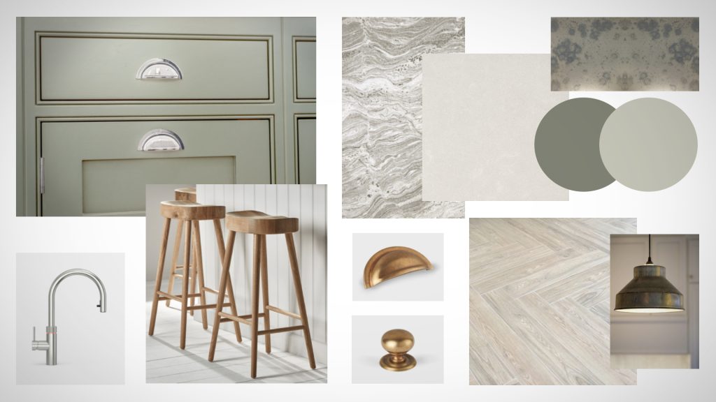 A classic mood board for a green kitchen with a traditional farmhouse feel. The design features classic shaker cabinetry handpainted in a two-tone green colour palette. The mood board use a combination of Farrow & Ball Chromarty light green cabinetry and a darker green Treron island.