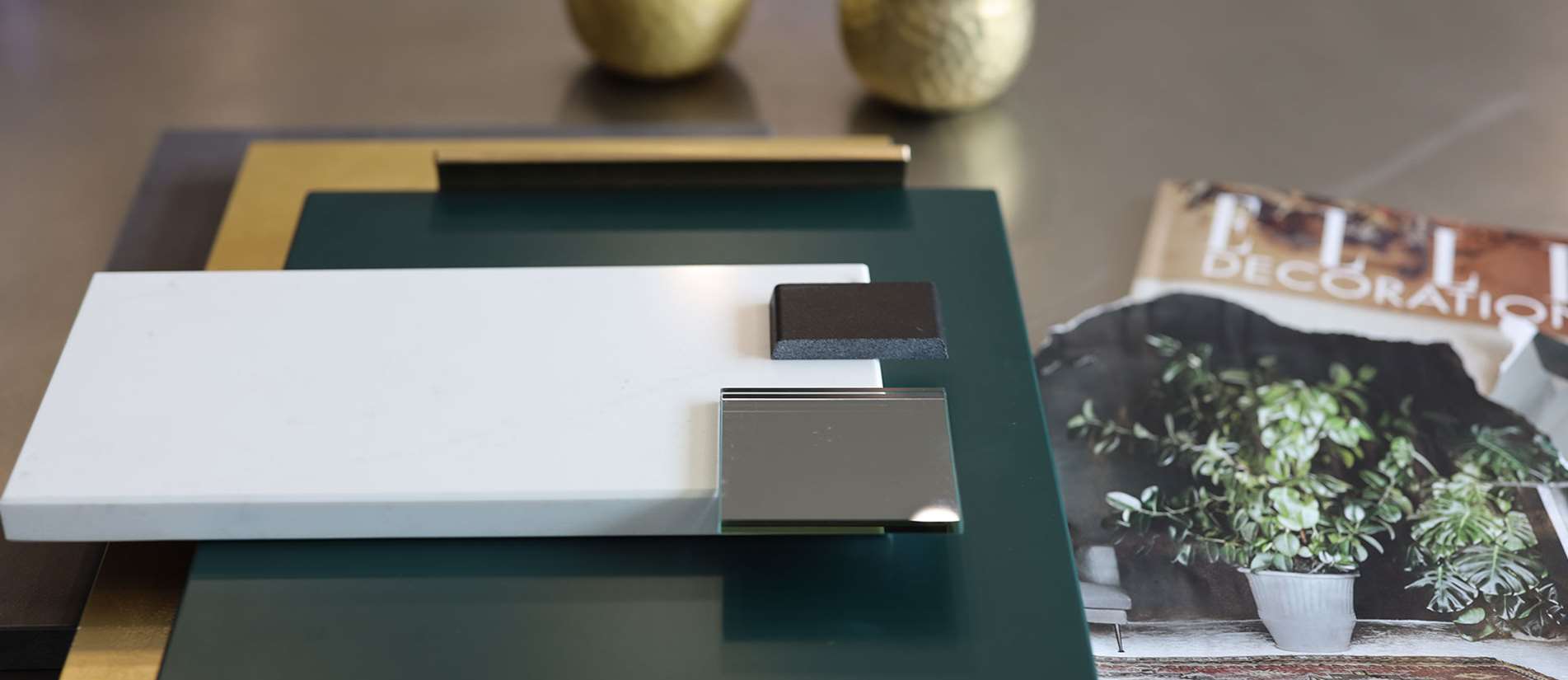 A contemporary mood board for a green kitchen with an Art Deco theme. The design uses a combination of cabinetry in dark Velvet Green satin lacquer, Metallic Gold and Putty Graphite laminate.